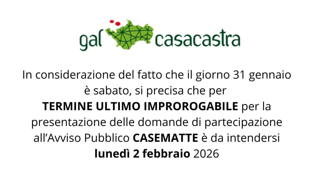 In considerazione del fatto che il giorno 31 gennaio è sabato, si precisa che per TERMINE ULTIMO IMPROROGABILE per la presentazione delle domande di partecipazione all’Avviso Pubblico CASEMATTE è da intendersi lunedì 2 febbraio 2026